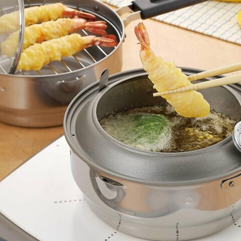 サイズ収納サイズ:W360×D225×H170mm、鍋本体:W200×D345×H80mm個装サイズ:35×23×17cm重量個装重量:1350g素材・材質鍋本体:ステンレス鋼(クロム18%)(底の厚さ:0.8mm)油とびガード:鉄(ふっ素樹脂塗膜加工)ハンドル:フェノール樹脂油こし網:18-8ステンレス製油切り網:鉄(クロムメッキ)仕様満水容量:1.9L適正容量:1L対応熱源:IH、ガスコンロ、ハロゲンヒーター、シーズヒーター、ラジエントヒーター食器洗浄機:使用不可電子レンジ・オーブン:使用不可取扱説明書付(パッケージ裏面)製造国日本広告文責 (有)パルス 048-551-7965オイルポット兼用の温度計付ステンレス天ぷら鍋!!揚げ鍋、油切り網、油飛びガード、そして油を処理するこし網、オイルポットが一つになりました!!パーツは全部重なるので収納もコンパクト。